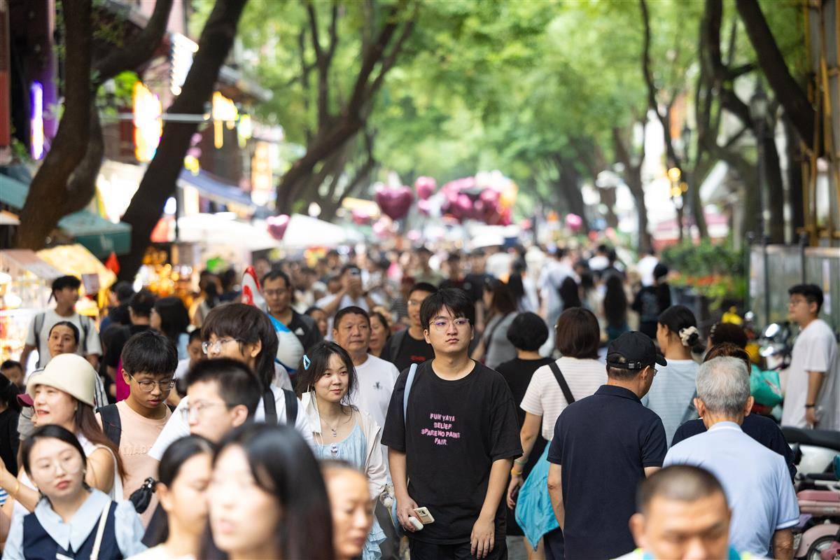 2025年10月4日,即国庆假日的第四天,在武汉江安区的Hankou历史景观区,许多游客在Lihuangpi Road上行走,无休止地沿着Lihuangpi Road行走。 Liyuangpi Road Street两岸的特许经营剩下的17座欧洲风格的建筑物,其中包括汉湖共产党中央委员会的前地点,前中国俄罗斯Daosheng Bank以及前俄罗斯警察局现场,目睹了武汉甚至中国的现代和现代变化。 (He Yuxin摄